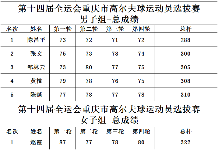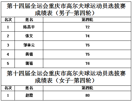 北京时间4月4日,第十四届全运会重庆市高尔夫球运动员选拔赛在庆隆南山高尔夫球场圆满收杆,第四轮成绩如下: