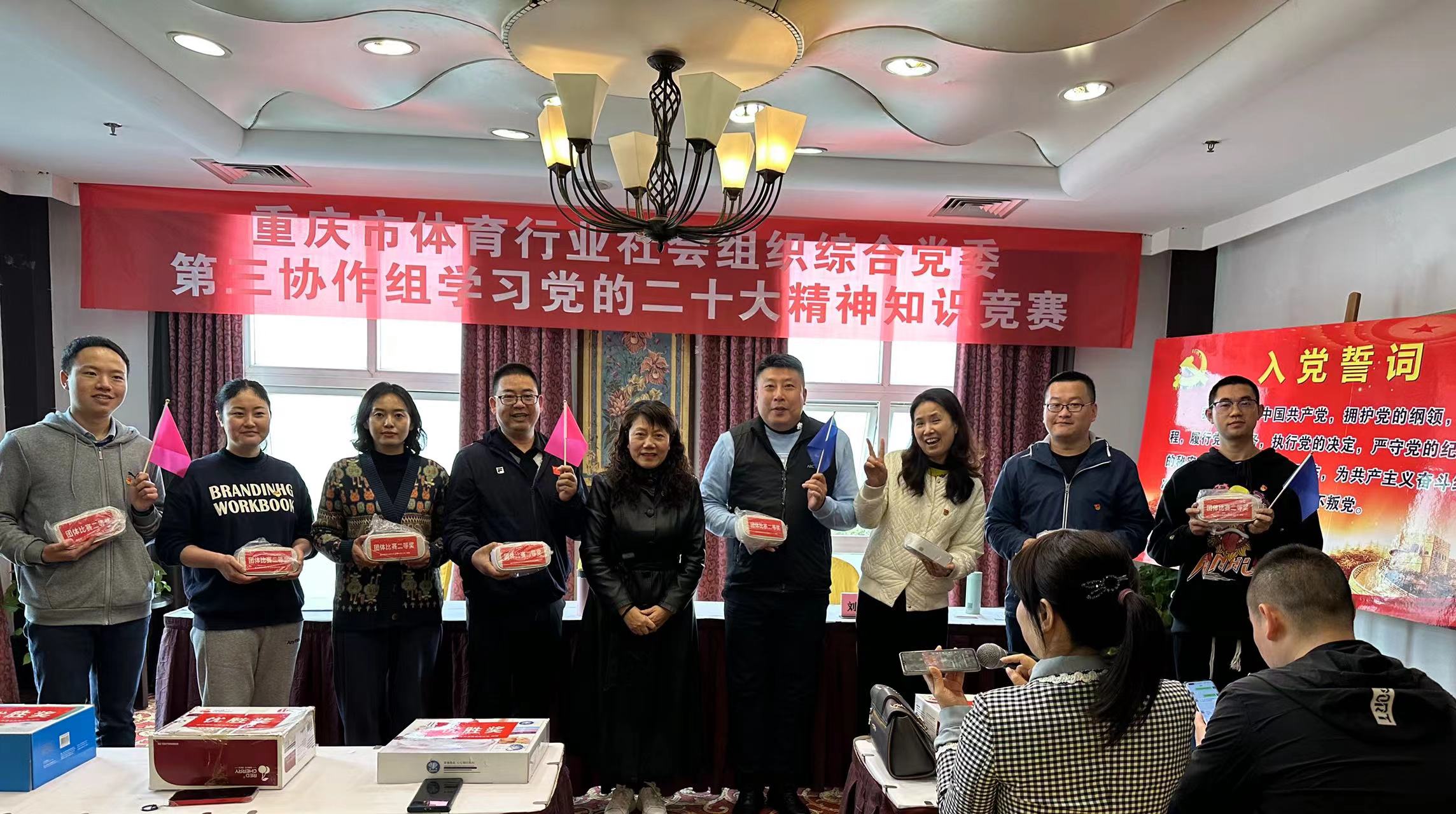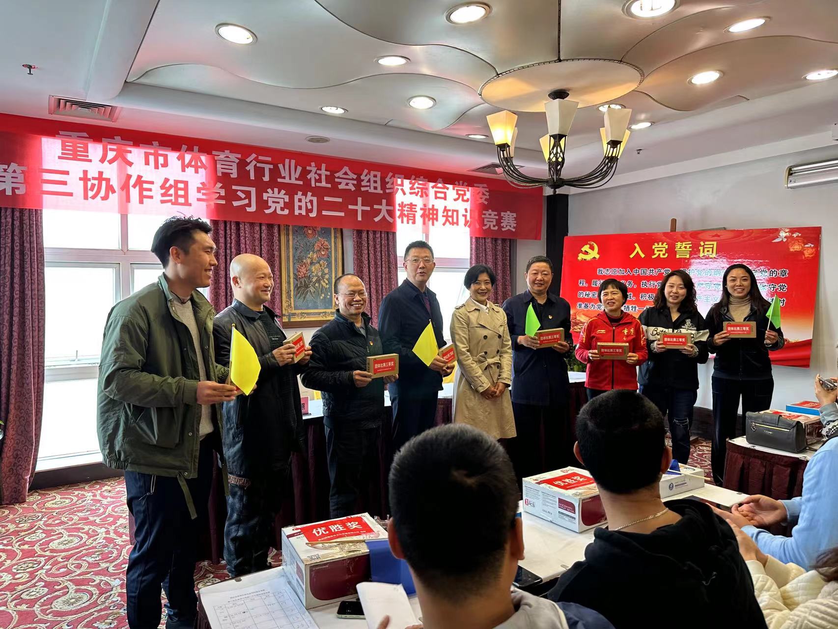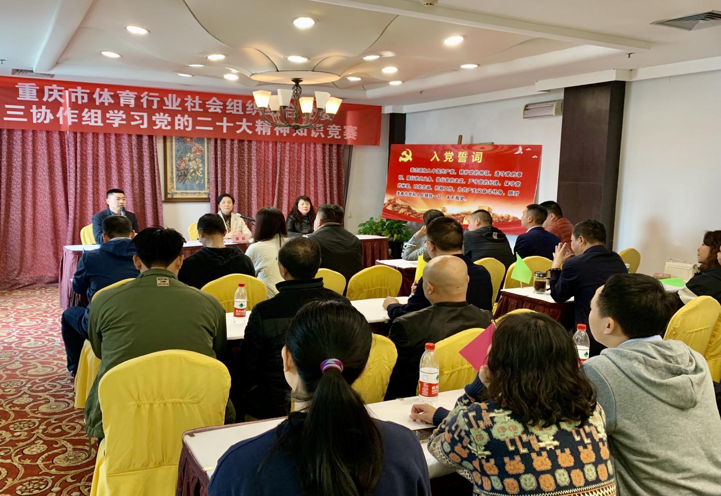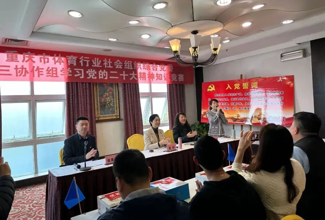 活动首先由张焰副书记带领全体党员重温入党誓词,大家以饱满的热情和昂扬的姿态庄严宣誓,激发了为党的事业奋斗终身的决心和激情。随后举办了党的二十大精神知识竞赛,分为红黄蓝绿紫5支队伍开展团队比赛和个人比赛,以“竞”激发学习热情,以“赛”坚定忠诚信念,促进全体党员加深了对党的新思想新论断新要求的认识理解,凝聚了思想共识、激发了奋进活力;知识竞赛期间,协作组党员演唱了歌曲《春风十万里》,以歌声表达对新时代的歌颂和对党的热爱。最后,开展了全民健身体育项目体验活动,让大家在运动中体会拼搏激情、加强交流沟通,进一步促进社会组织合作发展。