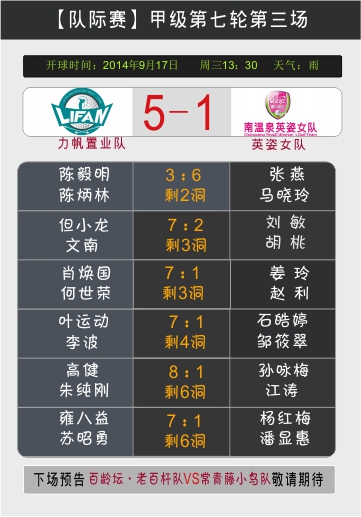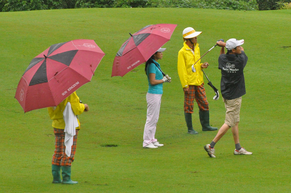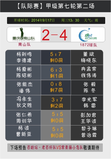 隆鑫地产杯2014重庆高尔夫球队际联赛甲级排名赛的最后两场比赛同时开打,对于南山球队、力帆置业球队、1872球队来说,这是艰难的一战,也是最关键的一战,这将决定哪两支球队将晋级到巅峰之战的冠军总决赛。然而天公不作美,凉风细雨中,穿着短袖POLO衫的队友们不敌凉意来袭,喝着姜茶解寒。